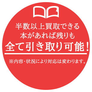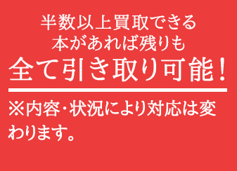 通常では買取を断られるような本も、もしご依頼品の約半数以上を買取できた場合は引き取り可能!かさばる本を手間なく片付けできるうれしいサービス。